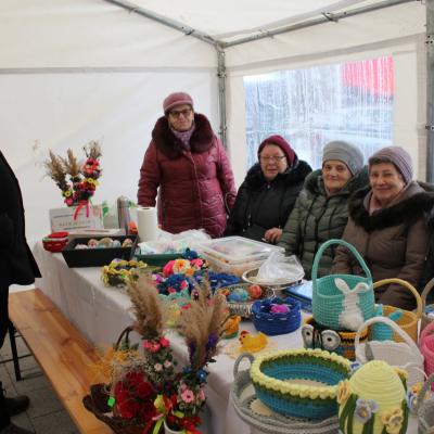 Kiermasz odbył się w zimowej scenerii, chociaż w kalendarzu już wiosna, w pobliżu miejscowego Domu Kultury, który tego dnia tętnił życiem. Stoiska pełne były kolorowych pisanek, ręcznie zdobionych koszyczków, tradycyjnych palm wielkanocnych, a także innych ozdób, które z pewnością wprowadziły wszystkich w radosny, świąteczny nastrój. W ofercie znalazły się także lokalne przysmaki, które przyciągnęły uwagę smakoszy – od świeżo wypiekanego chleba po pyszne ciasta i ciasteczka, które zaspokoiły apetyty odwiedzających.
